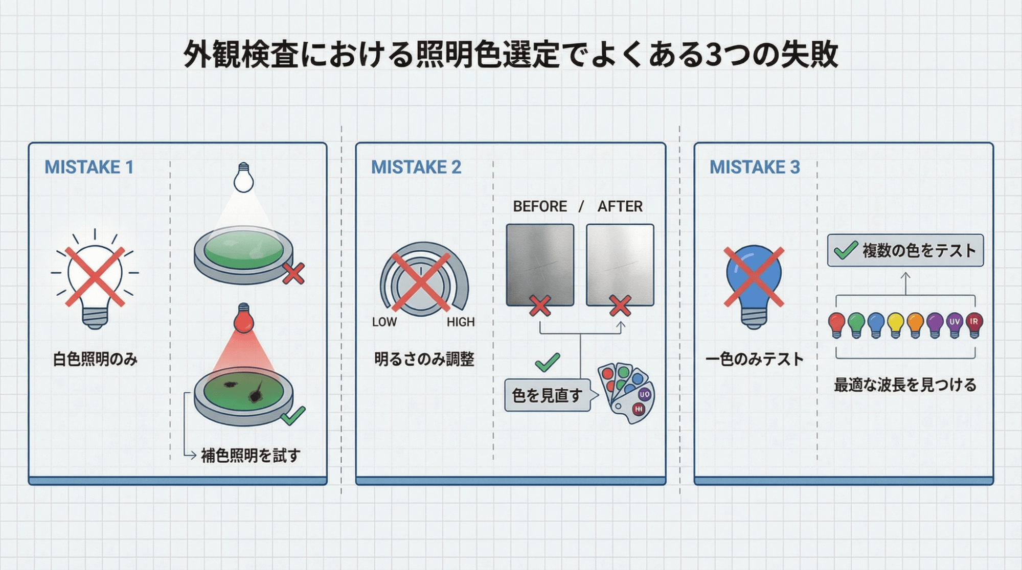 ワークと照明の色の組み合わせは多様であり、1色だけでは最適解を見逃している可能性が高いです。特に、微妙な色合いのワーク(オレンジ、ピンク、水色など)では、複数の照明色を試すことが重要です。
