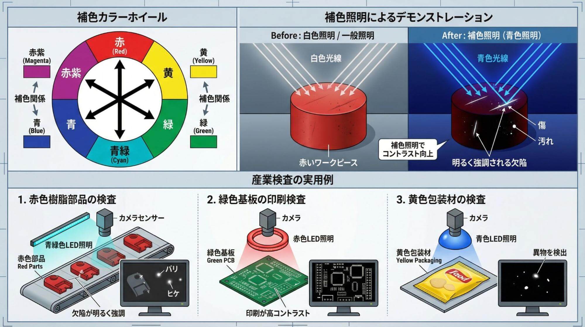 ワークの色によって最適な照明色は異なります。ここでは、「ワーク色と照明色の対応表」「補色照明が効果的なケース」「白色・黒色ワークの特殊な考え方」「多色混在ワークへの対応」の順に解説します。