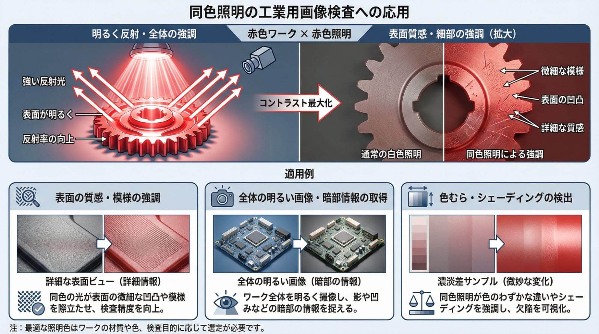 一方、ワークと同じ色の照明を使うと、ワーク表面が明るく強調されます。これは、ワーク表面が同色の光をよく反射するためです。