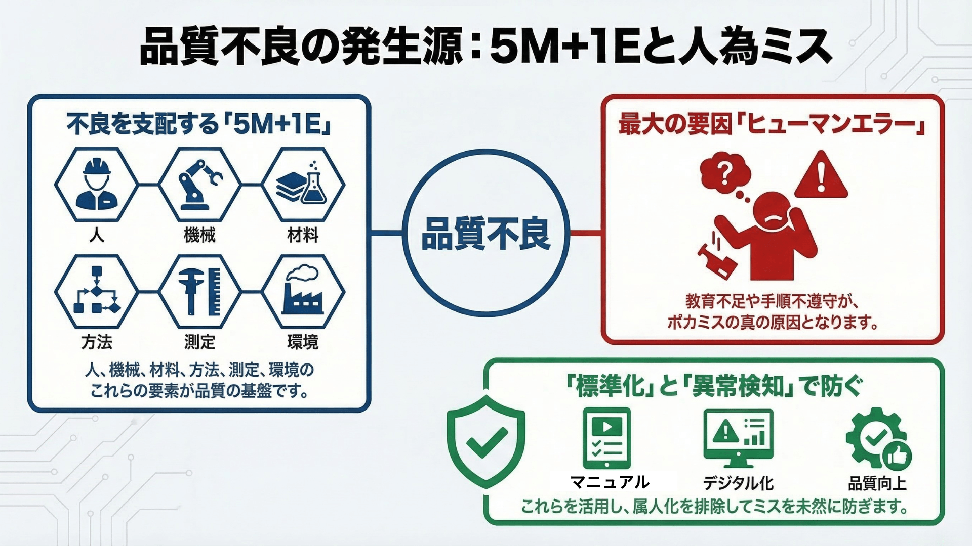 不良の原因を特定する上で欠かせないのが「5M+1E」の視点です。