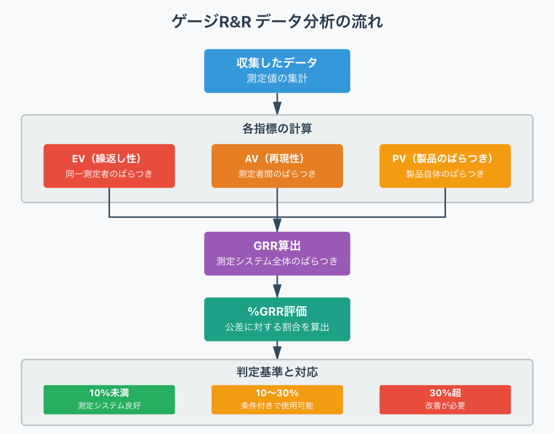 ゲージR&Rでは、収集したデータをもとに複数の指標を計算し、測定システムの信頼性を評価します。ここでは、計算の流れから具体的な指標、計算式、評価基準まで解説します。