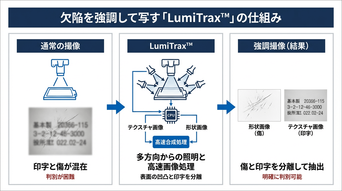 | LumiTrax™ | 形状画像とテクスチャ画像を分離し、印字と傷の切り分けに有効 |
