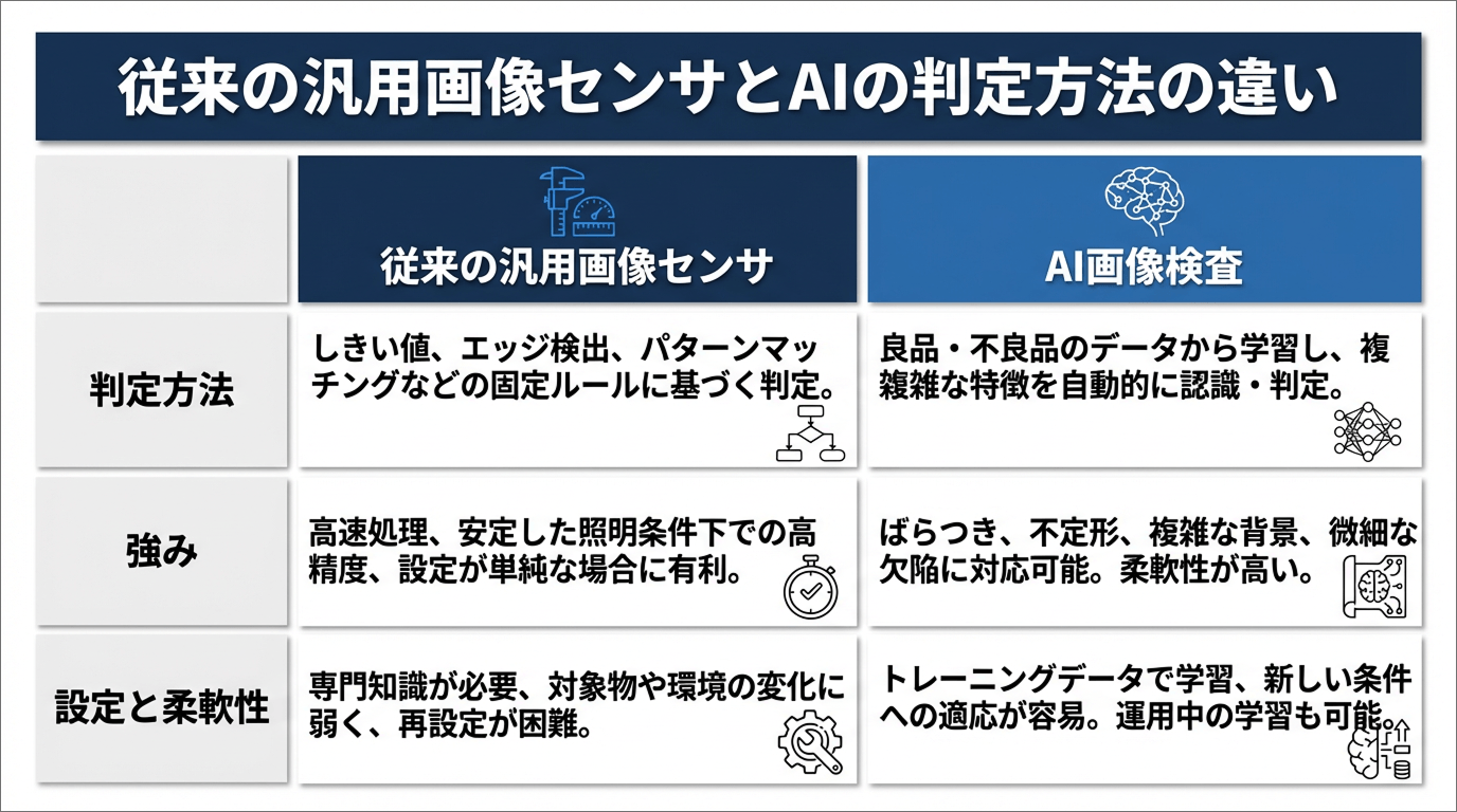 「画像センサを使った自動検査はもう導入している」という現場でも、AIを使う意味はあるのでしょうか。答えは、判定の仕組みが根本から異なる点にあります。