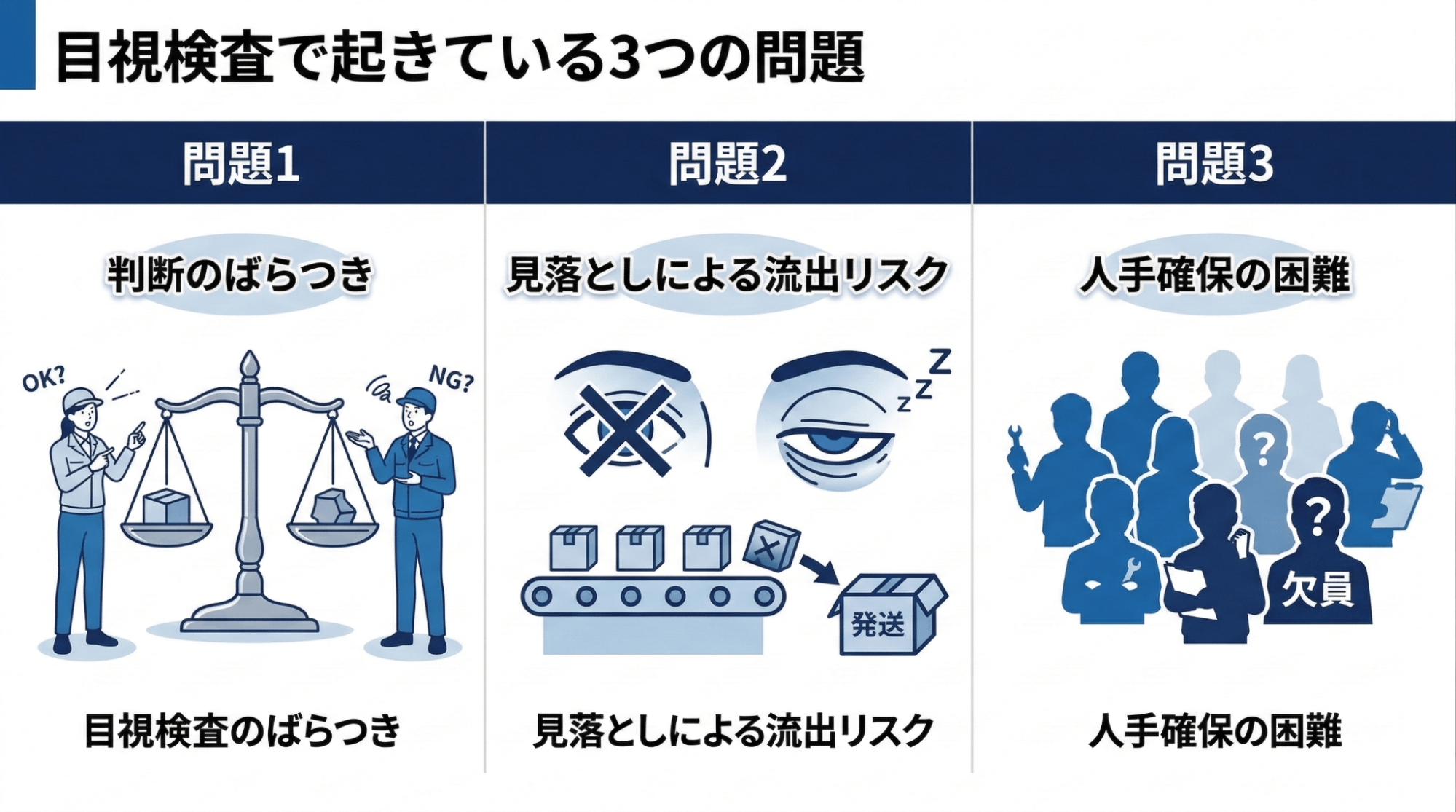 3つ目の問題は、人手の確保です。専任の検査員を安定的に配置し続けることは、昨今の人材不足のなかで年々難しくなっています。
