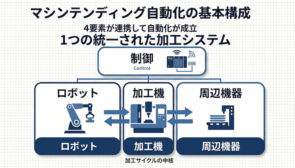 マシンテンディングの自動化は、ロボット単体で完結するものではありません。工作機械・周辺機器・制御システムを含めた複数の要素が連携して、はじめて一つの加工サイクルとして成立します。まず、構成要素とその役割を以下の表で整理します。
