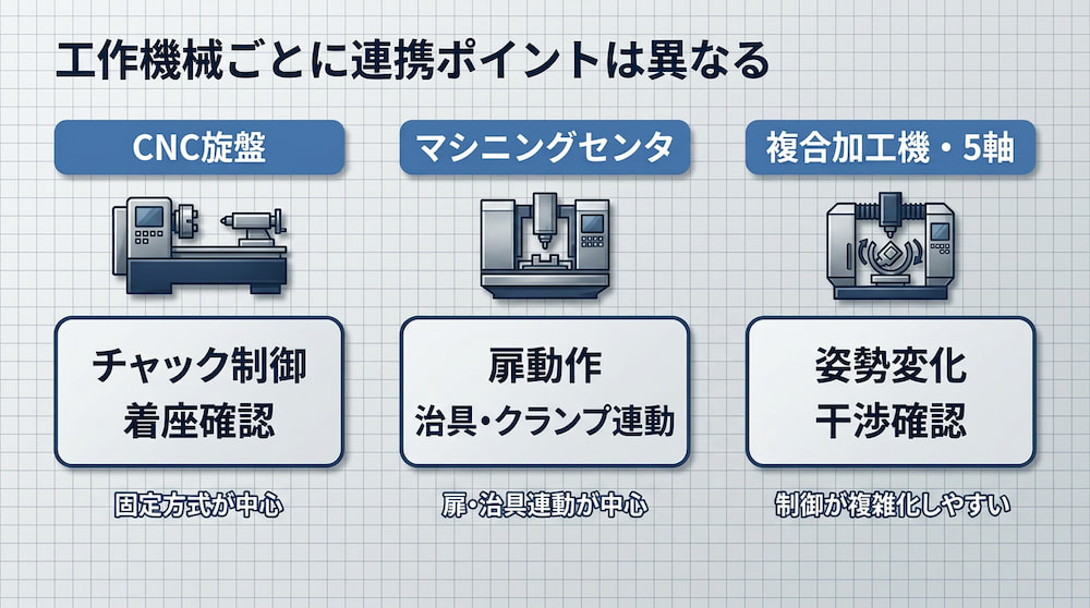 工作機械の種類によって連携の論点は変わります。旋盤とマシニングセンタでは、ワークの固定方式、扉の構造、加工中の姿勢変化などが異なるため、確認すべき項目も違ってきます。主な連携ポイントの違いを以下の比較表にまとめます。