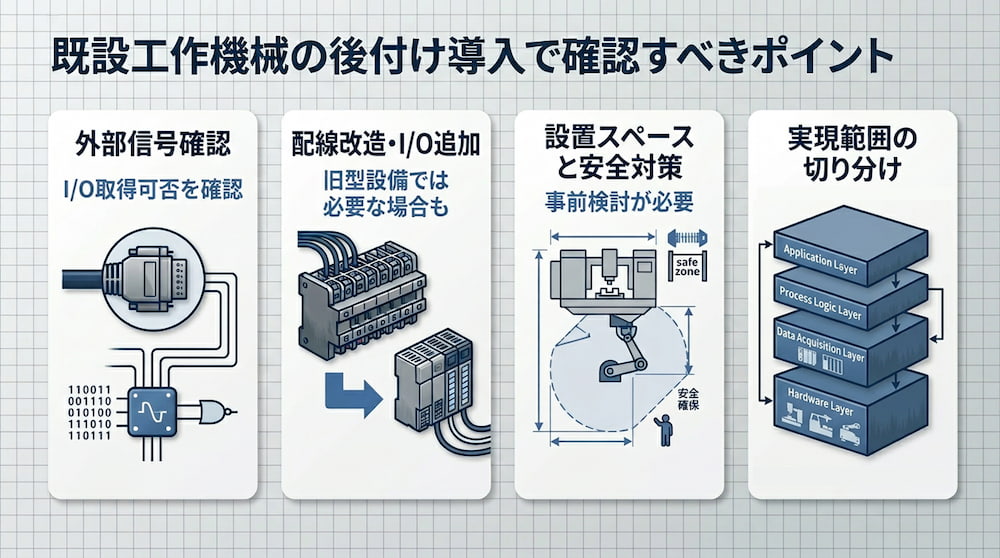 後付け導入の検討で最も重要なのは、既設設備の条件のもとで実現できることと難しいことを早い段階で切り分けることです。