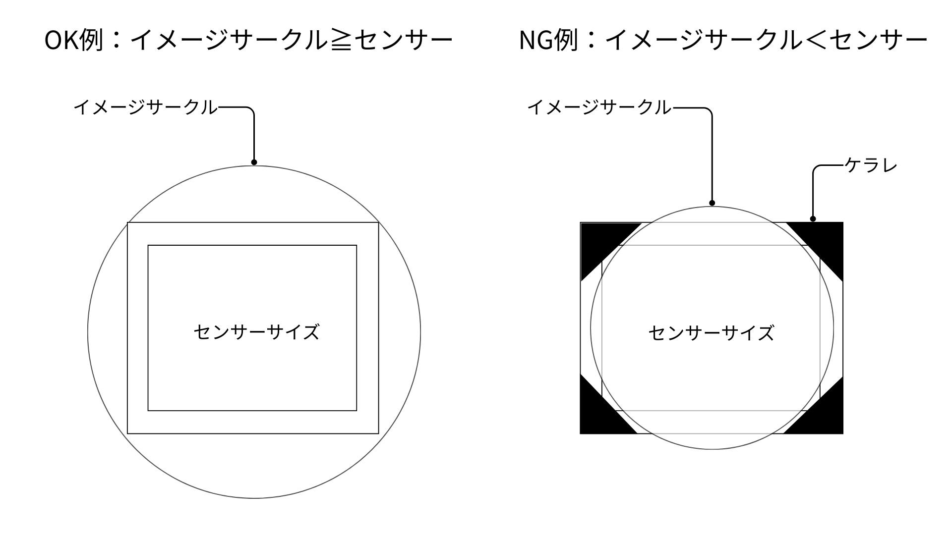 レンズが投影する円形の像(イメージサークル)がセンサーサイズよりも小さくなると、画像の四隅が黒くなる「ケラレ」と呼ばれる現象が起きて鮮明な撮像ができなくなるため、注意が必要です。必要な画角を得るためには、レンズのイメージサークルがセンサーのサイズ以上になるように選定する必要があります。