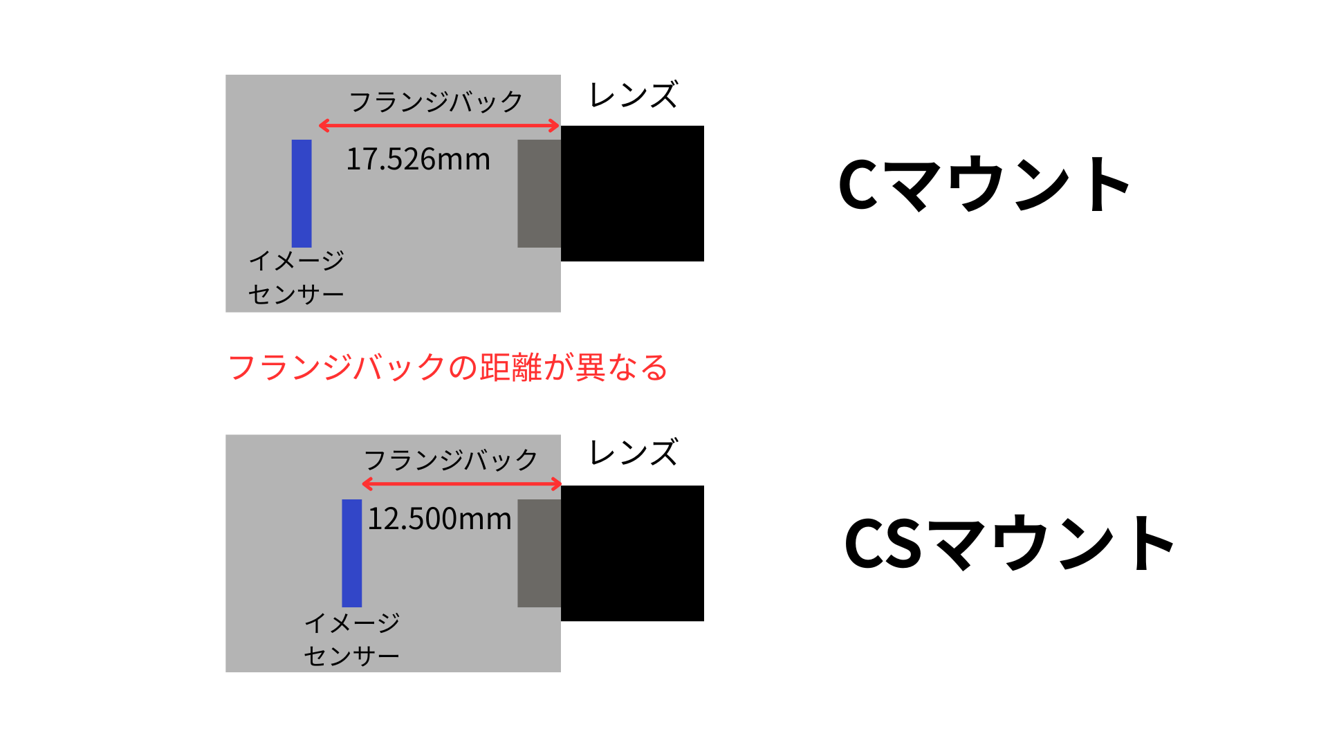 産業用カメラの主要なマウントは、JEITA規格の「Cマウント」と「CSマウント」の2つがあり、それぞれフランジバック(※)に違いがあります。