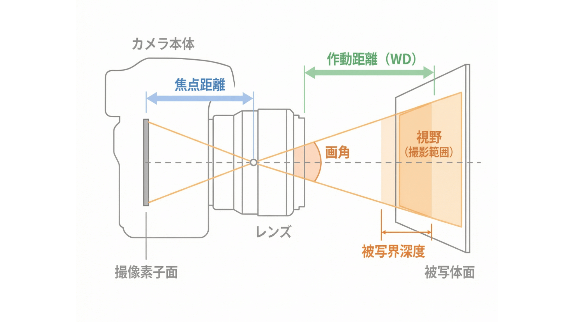 | 作動距離 | 焦点(ピント)が合っているときのレンズの先端から対象物までの距離。WD(ワーキングディスタンス)とも呼ばれる。 |