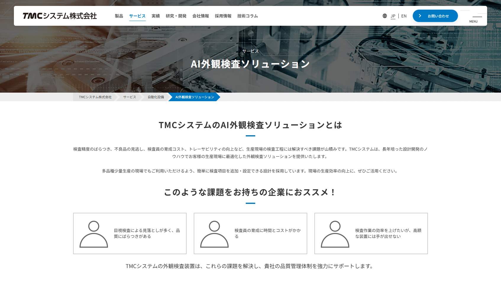 TMCシステムでは、製造現場の検査工程を自動化する『AI外観検査ソリューション』を提供しています。用途や現場の制約を伺ったうえで、カメラ・レンズの選定から撮像構成の提案まで一緒に対応しています。