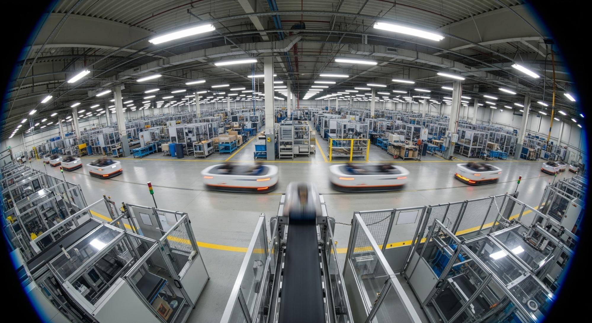 魚眼レンズは、通常の広角レンズよりも広い画角(180°以上)の撮像ができるレンズです。空間の広い範囲を1つの画像に収められるため、自動搬送車の動体検知やエリア監視などを目的としたマシンビジョンに活用されています。