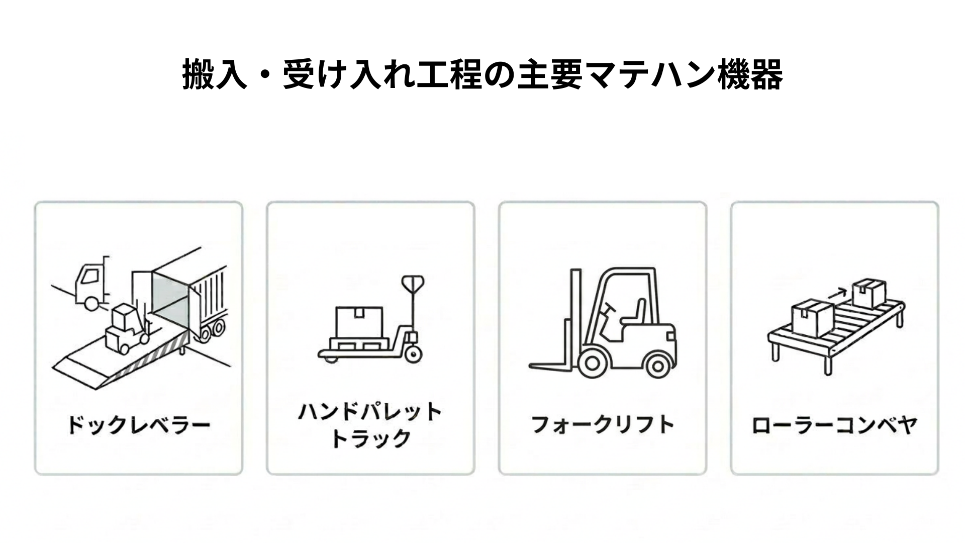 外部から届いた部品や資材をスムーズに受け入れる起点の工程です。マテハンを導入することで、段差処理や重量物運搬における労災リスクを減らし、安全性の確保と作業スピードの安定化に直結します。