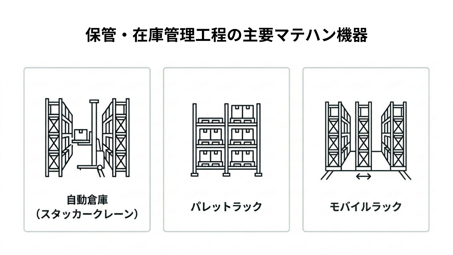 | 自動倉庫(スタッカークレーン) | 高層棚に自動で出入庫を行う | 部品や製品の集中保管 |