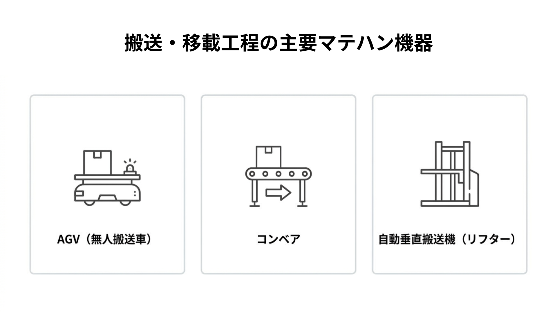 | コンベア | 一定方向に物を流し続ける定置型の搬送装置 | 組立ライン、出荷前仕分け工程 |