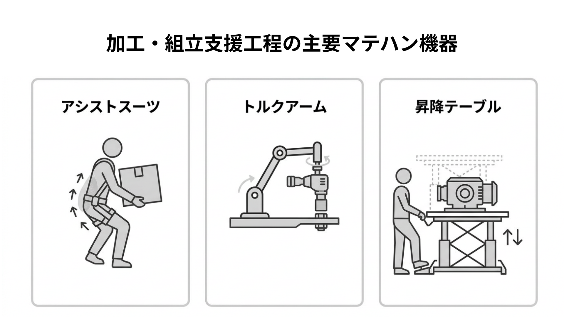 | アシストスーツ | 作業者の動作を補助し、身体の負担を軽減する | 重量部品の持ち上げ、組立・溶接ラインなど |