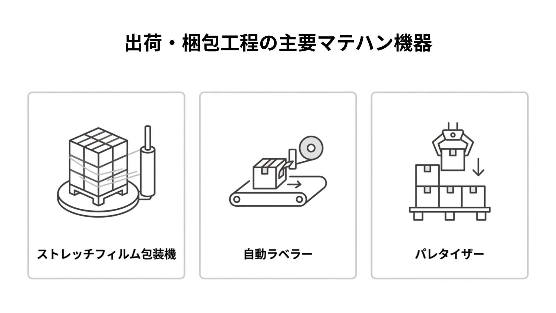 | ストレッチフィルム包装機 | 製品やパレット荷物を自動でフィルム包装し荷崩れを防ぐ | パレット出荷、防塵・防湿が必要な現場 |